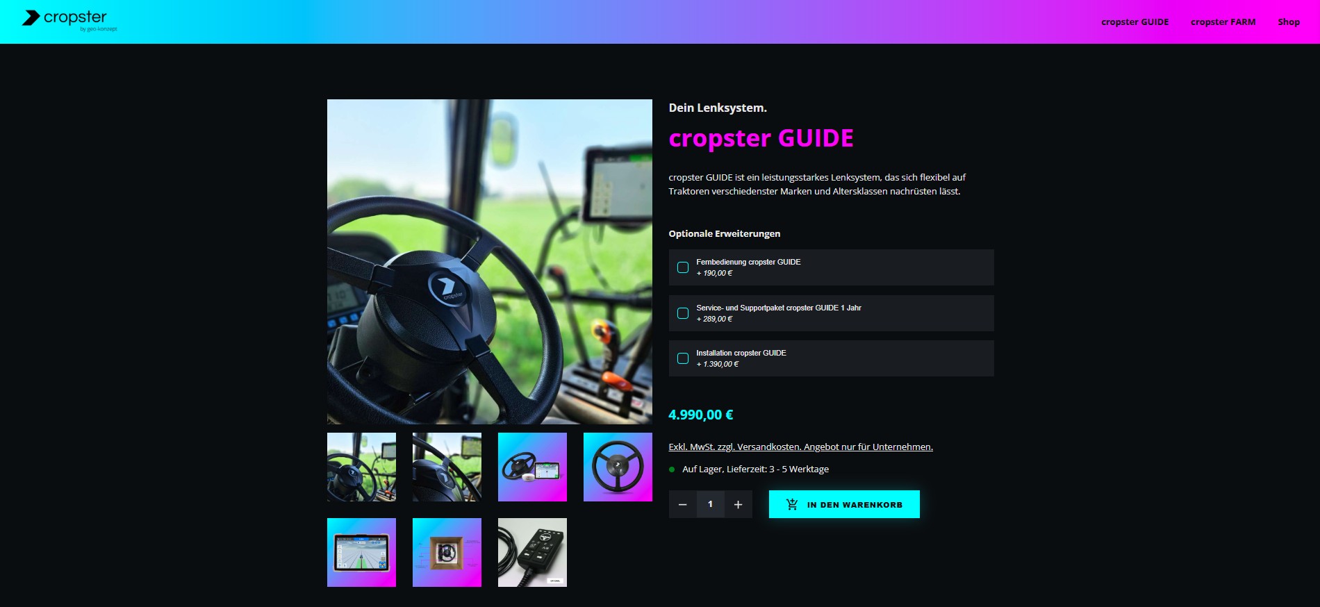 Mit cropster FARM und cropster GUIDE hat geo-konzept vor Kurzem zum ersten Mal eine eigene Produktwelt aus Hard- und Software auf den Markt gebracht, die miteinander verknüpft ist – und gleichzeitig offen für andere Systeme bleibt. Nun folgt der nächste Schritt: Der bequeme Onlineshop für das cropster-Universum.