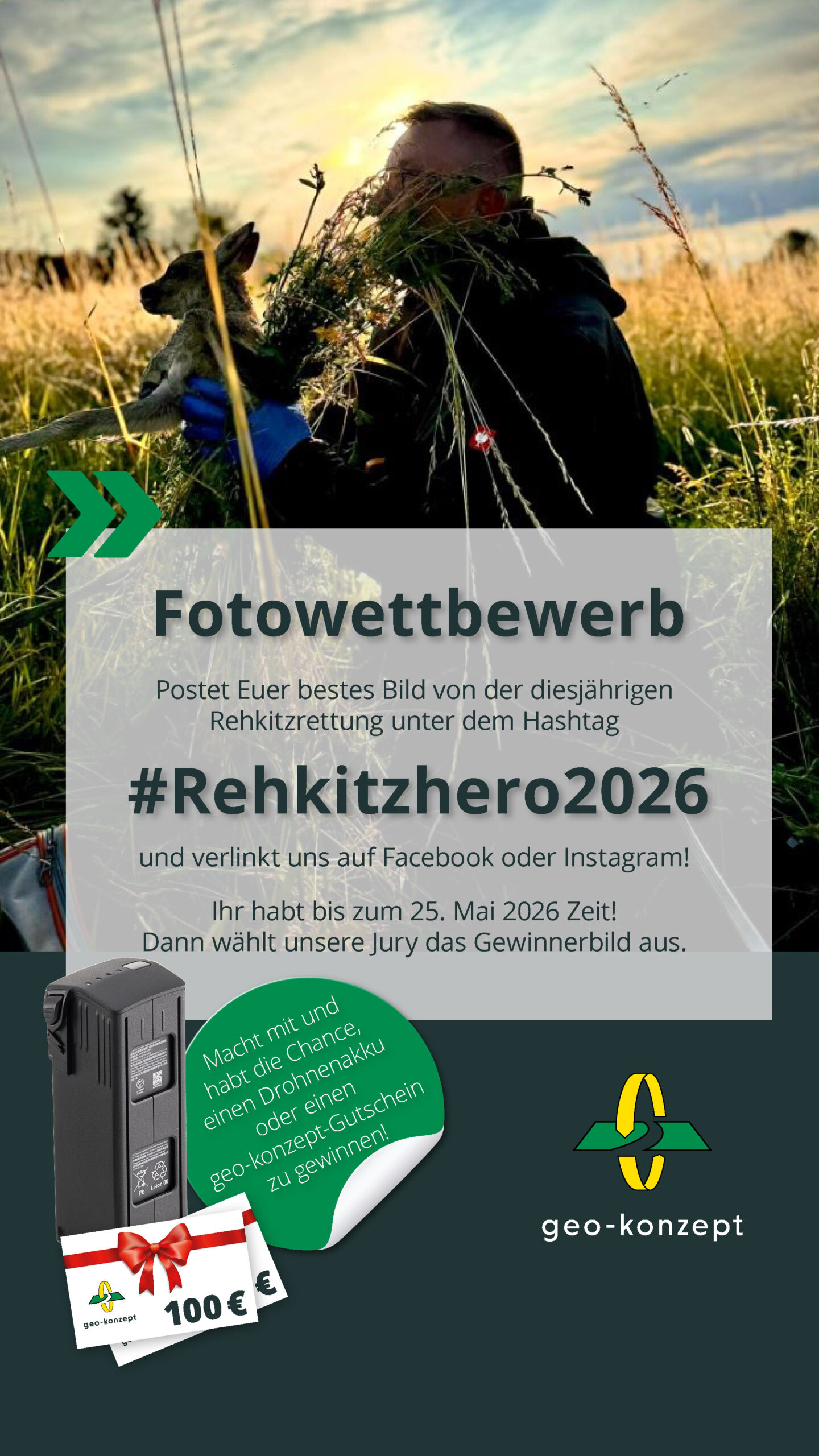 Um am Gewinnspiel teilzunehmen, muss innerhalb des Aktionszeitraumes ein (oder mehrere) Fotos aus der diesjährigen Rehkitzsuche auf Instagram oder Facebook gepostet und mit dem Hashtag „#Rehkitzhero2026“ versehen sowie der Account von geo-konzept verlinkt werden. Eine Jury aus unserem Hause wird im Anschluss alle teilnehmenden Fotos sichten und die drei Gewinnerfotos auswählen. Die Verkündung der Gewinner erfolgt am 07.06.2026.
